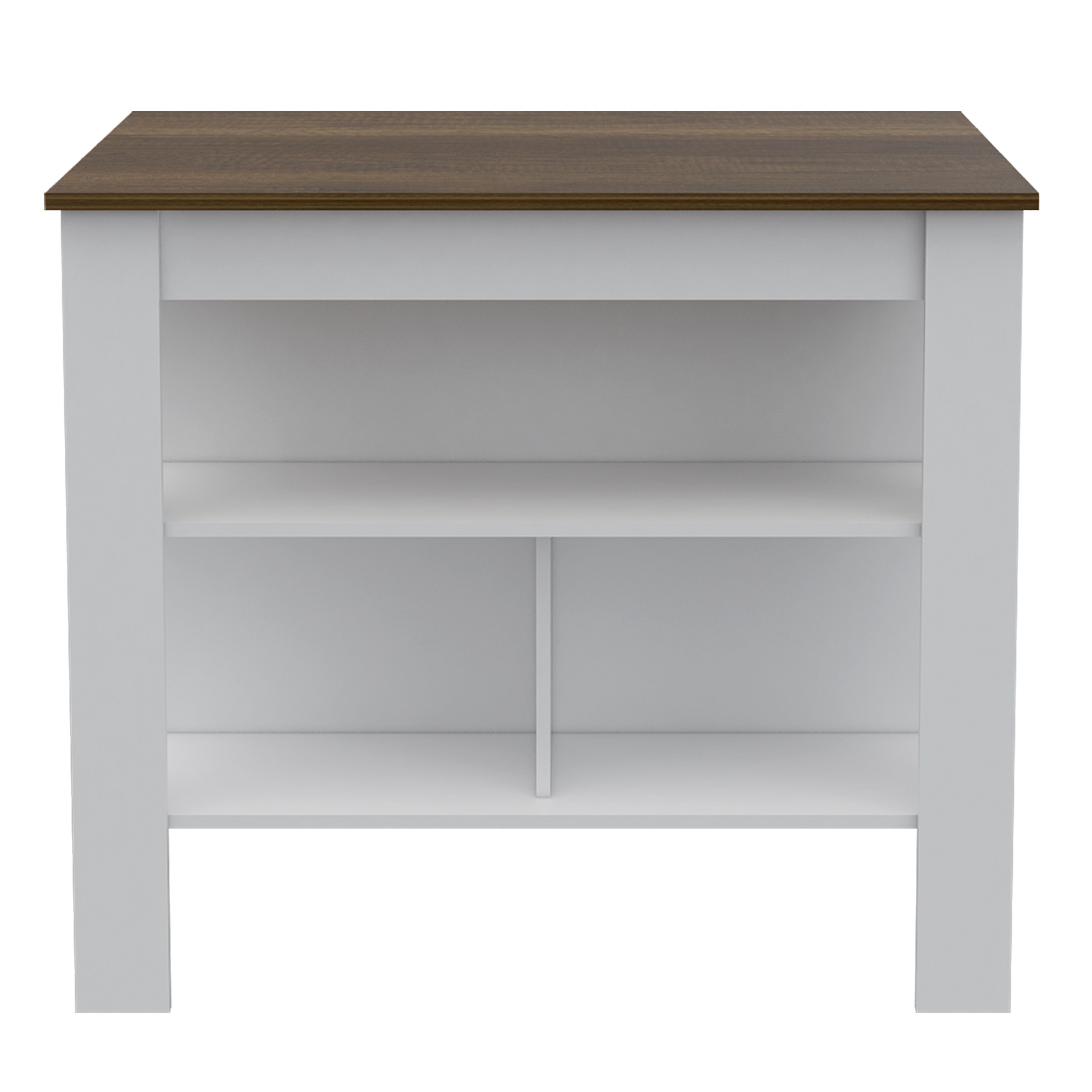 The TuHome Cala Kitchen Island brings style and functionality to your kitchen space. The large tabletop provides an open work area / display shelf. Below the tabletop; you will find one side with two shelves for additional storage space (12 In Height x 12 in Deep x 38 in Lenght). The bottom shelf is split into two equal sections; all of them are perfect for displaying any decor; pots; pans or having kitchen utensils handy when you need them; The other side is designed to be a working station where you can sit with leg room to confortably prep your meals. This two-tone finished piece is sure to draw the attention of your guests. Product Dimensions: 35.4 H x 40.5 W x 27.5 D