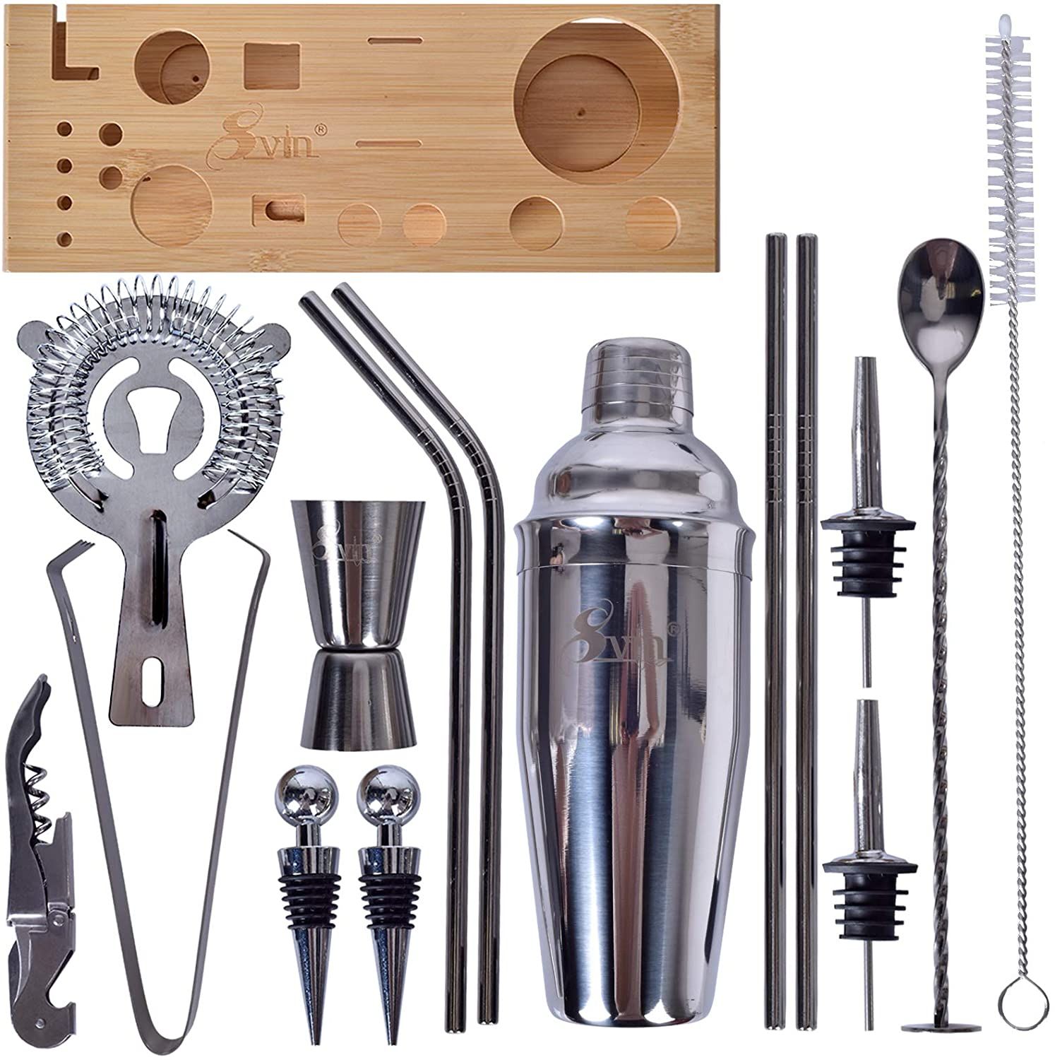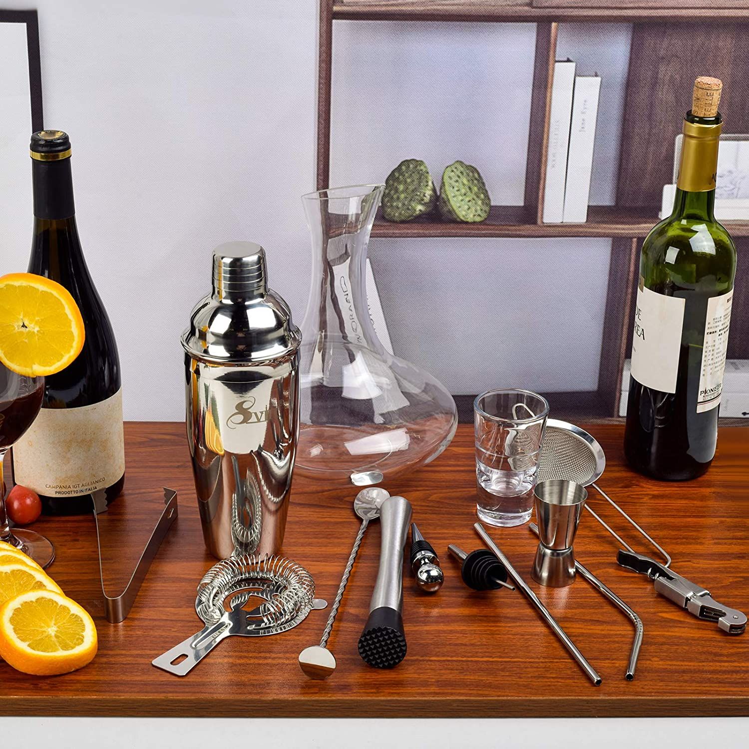 20 Piece Stainless Steel Shaker Set. Bar-grade cocktail mixer shaker 25oz (750ml), twisted spoon, muddler, double jigger, ice tong, Hawthorne strainer, fine mesh strainer, 2 wine stoppers, 2 pouning spouts, corkscrew, 2 straight drinking straw, 2 drinking straw, straw cleaning brush, velvet bag, natural bamboo stand, cocktail receipt pages.
