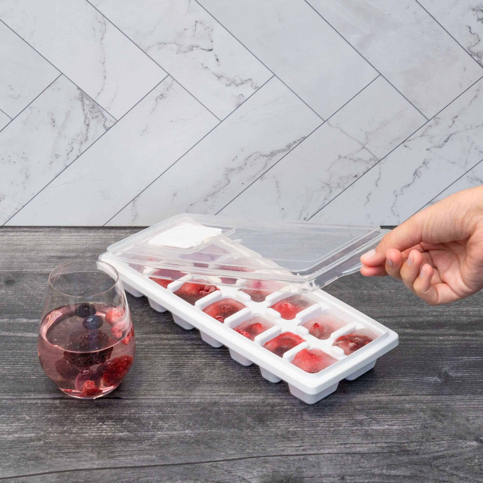 Complete your collection of everyday kitchen gadgets with the Mainstays Ice Cube Tray. This freezable ice cube tray features 14 ice cube molds and a removable lid and storage bin to allow you to make up to 14 ice cubes at a time and keep all your favorite beverages chilled and ice cold. Use them to freeze water for standard-sized ice cubes, or get creative and make flavored frozen cubes from a variety of liquids such as fruit juice, lemonade, tea, or coffee. Constructed from sturdy yet lightweight plastic, the ice tray is safe for the freezer so you can enjoy your ice cubes worry-free. This space-saving ice cube tray takes up minimal space in the freezer and is perfect for college dorms, apartments, or houses that don't have ice makers in the refrigerator.